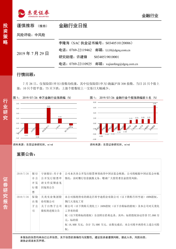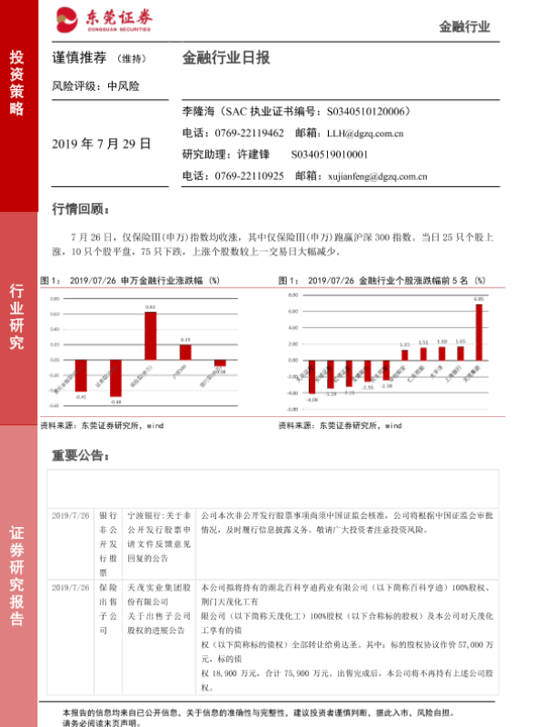 【东莞证券】【20190729】金融行业日报-8页