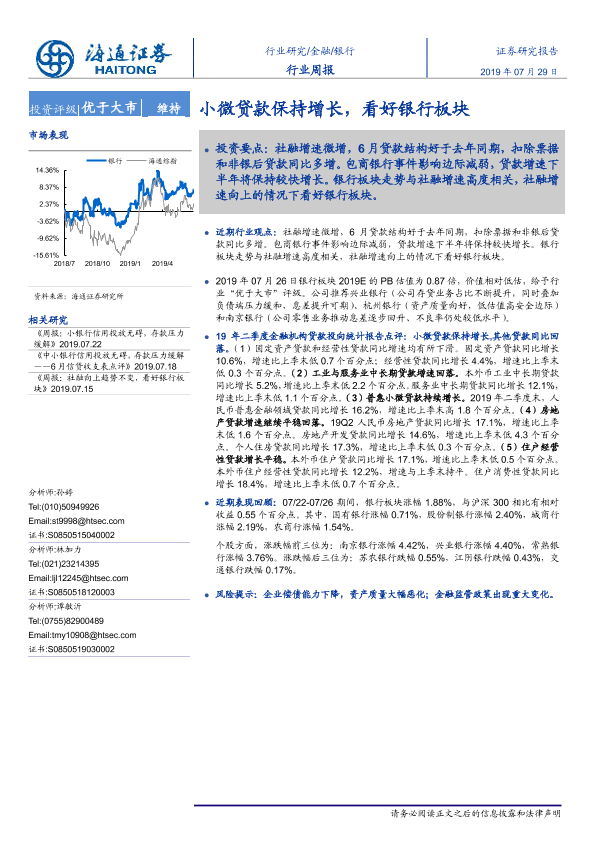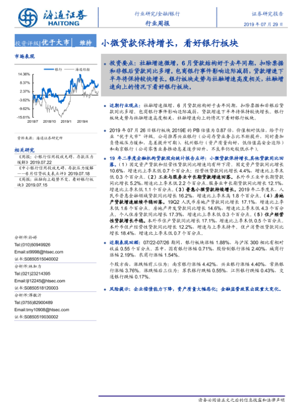 【海通证券】【20190729】银行行业周报:小微贷款保持增长,看好银行板块-9页