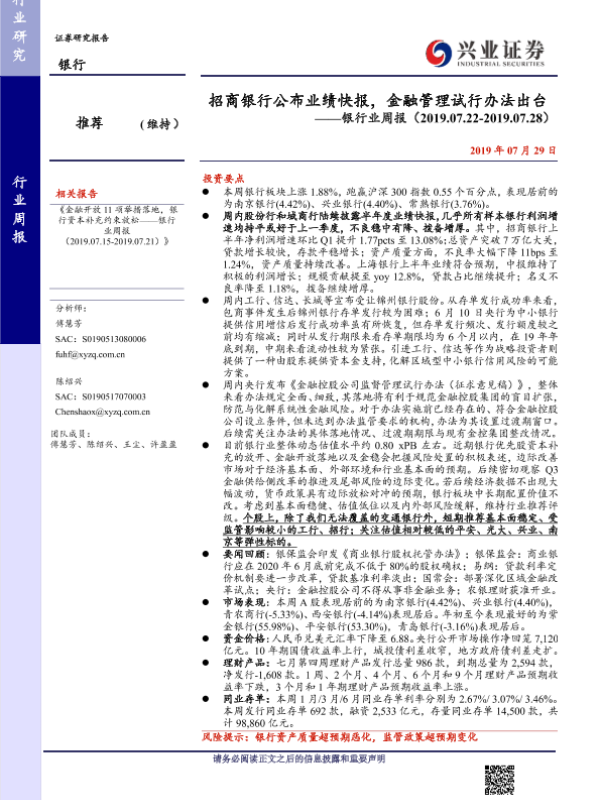 【兴业证券】【20190729】招商银行公布业绩快报,金融管理试行办法出台-12页