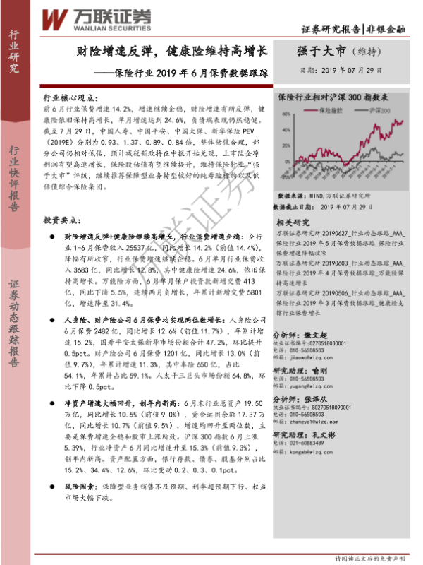 【万联证券】【20190729】保险行业2019年6月保费数据跟踪:财险增速反弹,健康险维持高增长-6页
