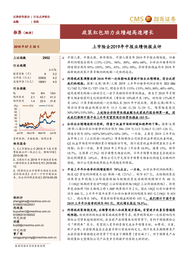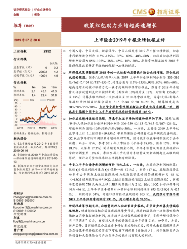 【海通证券】【20190730】上市险企2019年中报业绩快报点评:政策红包助力业绩超高速增长-3页