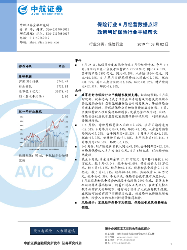 【中航证券】【20190802】保险行业6月经营数据点评:政策利好保险行业平稳增长-4页