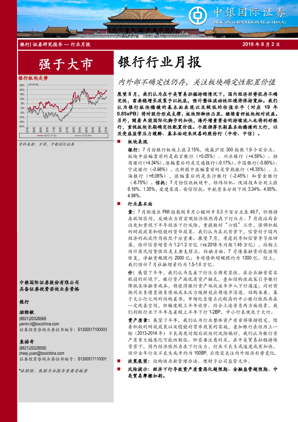 【中银证券】【20190802】银行行业月报:内外部不确定性仍存,关注板块确定性配置价值-19页