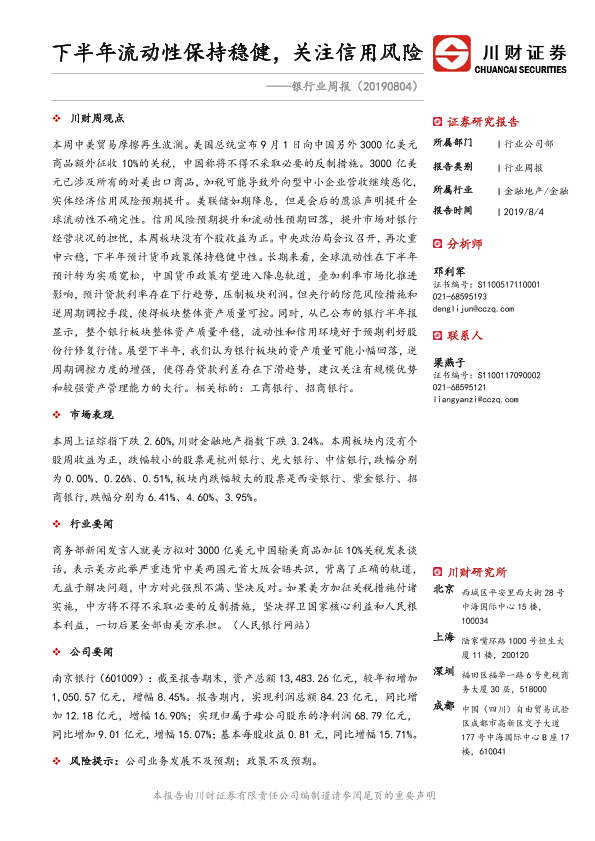 【川财证券】【20190804】下半年流动性保持稳健,关注信用风险-12页