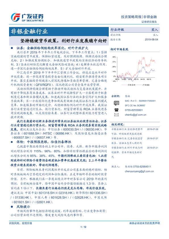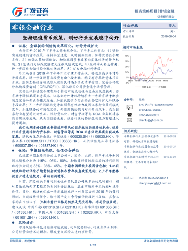 【广发证券】【20190804】非银金融行业投资策略周报:坚持稳健货币政策,利好行业发展稳中向好-12页