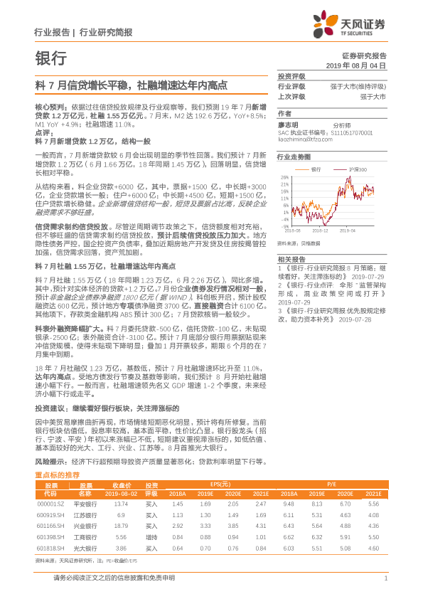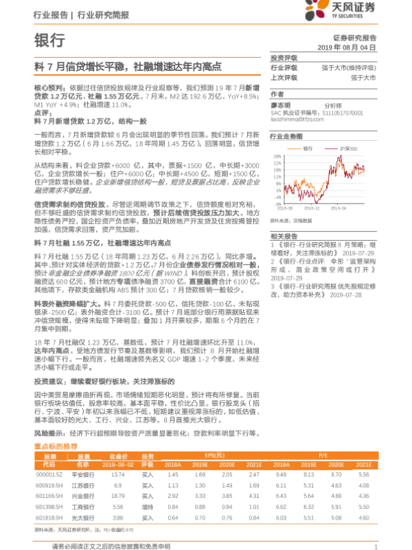 【天风证券】【20190804】料7月信贷增长平稳,社融增速达年内高点-5页