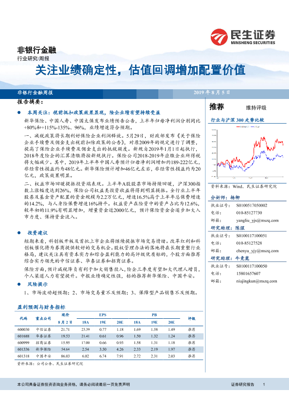 【民生证券】【20190805】非银行金融周报:关注业绩确定性,估值回调增加配置价值-13页