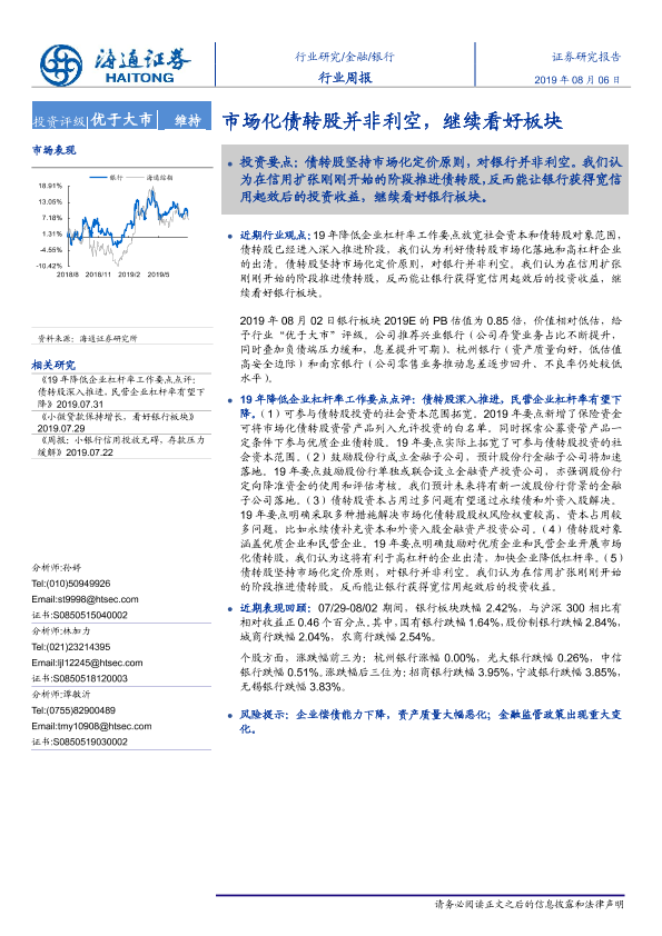 【海通证券】【20190806】银行行业周报:市场化债转股并非利空,继续看好板块-9页