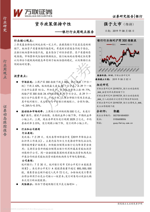 【万联证券】【20190805】银行行业周观点报告:货币政策保持中性-10页