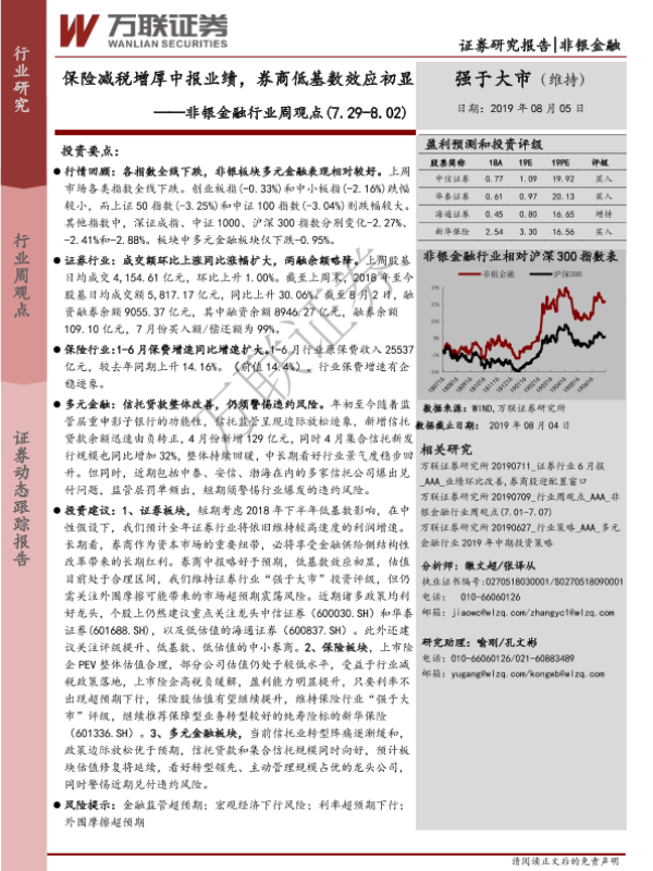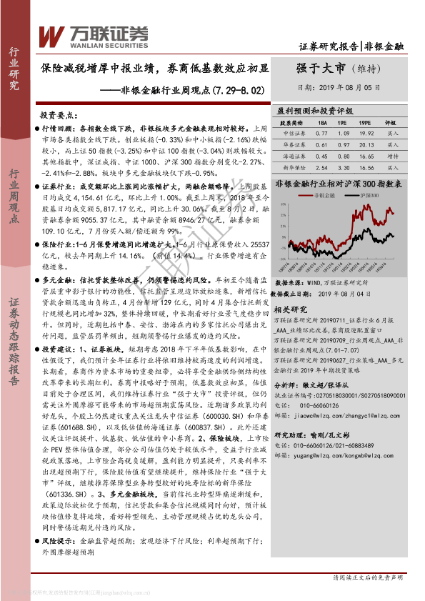 【万联证券】【20190805】非银金融行业周观点:保险减税增厚中报业绩,券商低基数效应初显-15页