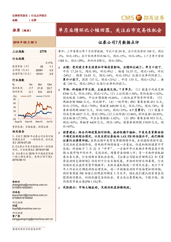 7月数据 业绩分析 交易性机会 市场展望 证券公司
