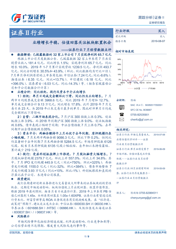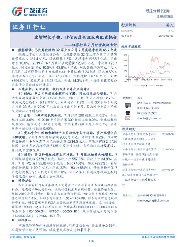 【广发证券】【20190807】证券行业7月经营数据点评:业绩增长平稳,估值回落关注板块配置机会-9页