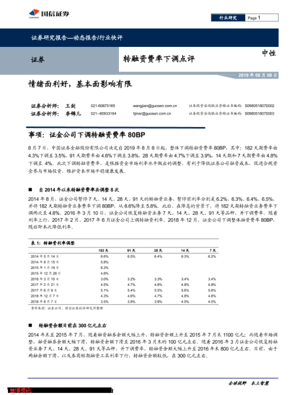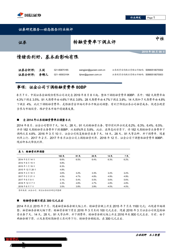 【国信证券】【20190808】证券行业转融资费率下调点评:情绪面利好,基本面影响有限-5页