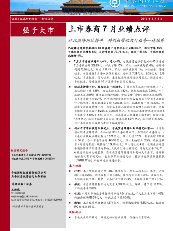 【中银证券】【20190808】上市券商7月业绩点评:环比微降同比持平,科创板带动投行业务一枝独秀-9页