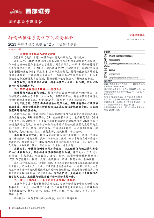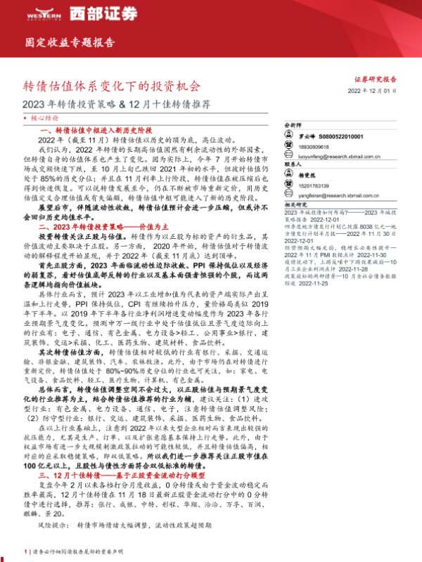 【西部证券】【20221201】2023年转债投资策略&12月十佳转债推荐:转债估值体系变化下的投资机会-18页