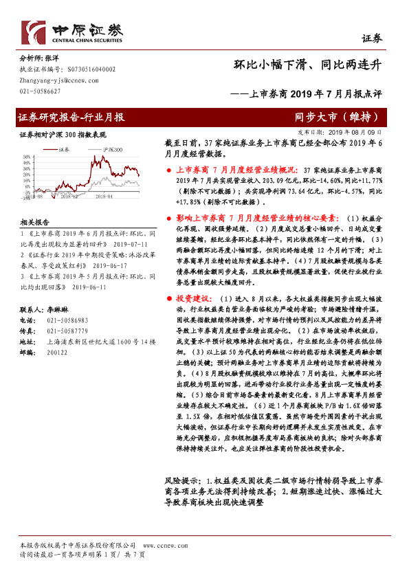 【中原证券】【20190809】上市券商2019年7月月报点评:环比小幅下滑、同比两连升-7页