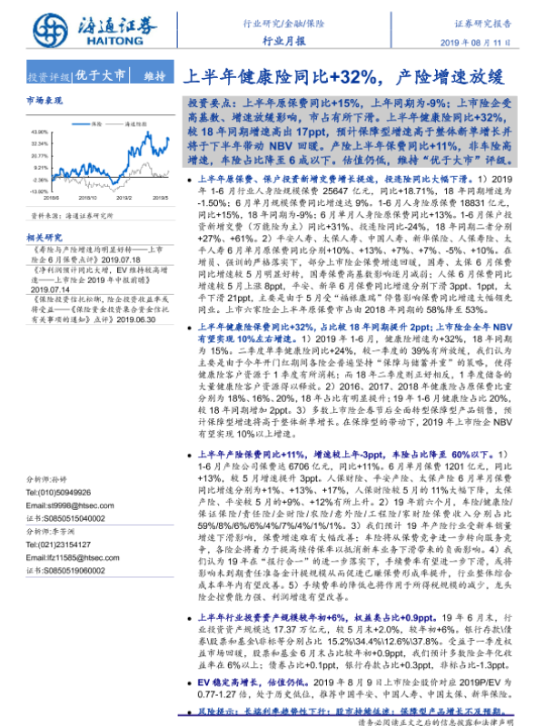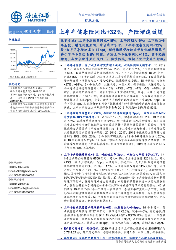 【海通证券】【20190811】保险行业月报:上半年健康险同比32%,产险增速放缓-5页