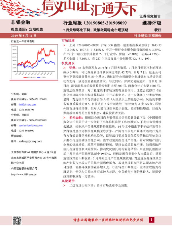 【山西证券】【20190811】非银金融行业周报:7月业绩环比下降,政策微调稳定市场预期-7页