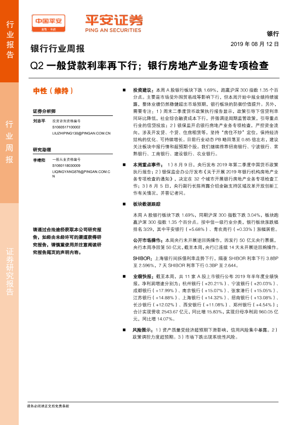 【平安证券】【20190812】Q2一般贷款利率再下行;银行房地产业务迎专项检查-7页