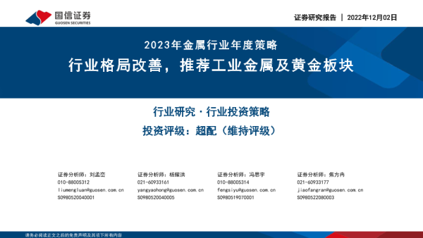 【国信证券】【20221202】2023年金属行业年度策略:行业格局改善,推荐工业金属及黄金板块-60页