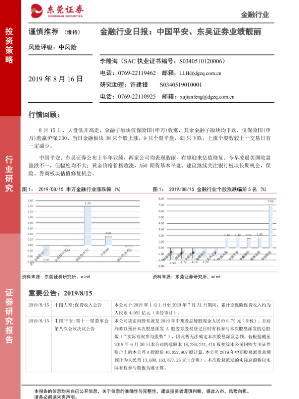 【东莞证券】【20190816】金融行业日报:中国平安、东吴证券业绩靓丽-4页