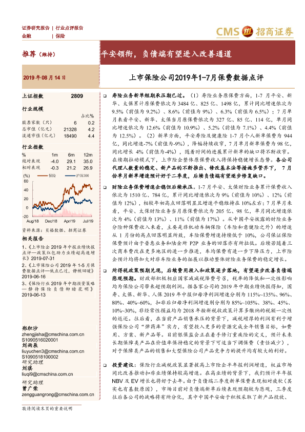【海通证券】【20190814】上市保险公司2019年1-7月保费数据点评:平安领衔,负债端有望进入改善通道-5页