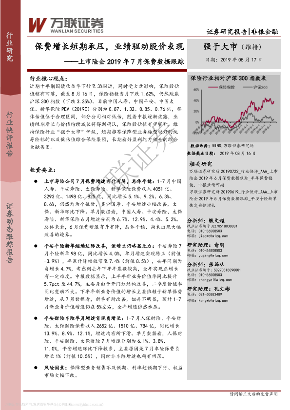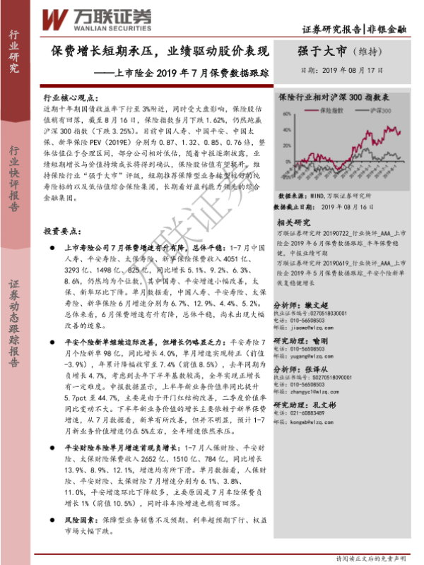 【万联证券】【20190817】上市险企2019年7月保费数据跟踪:保费增长短期承压,业绩驱动股价表现-3页