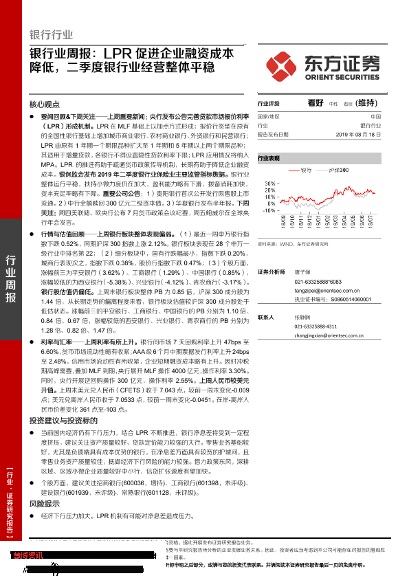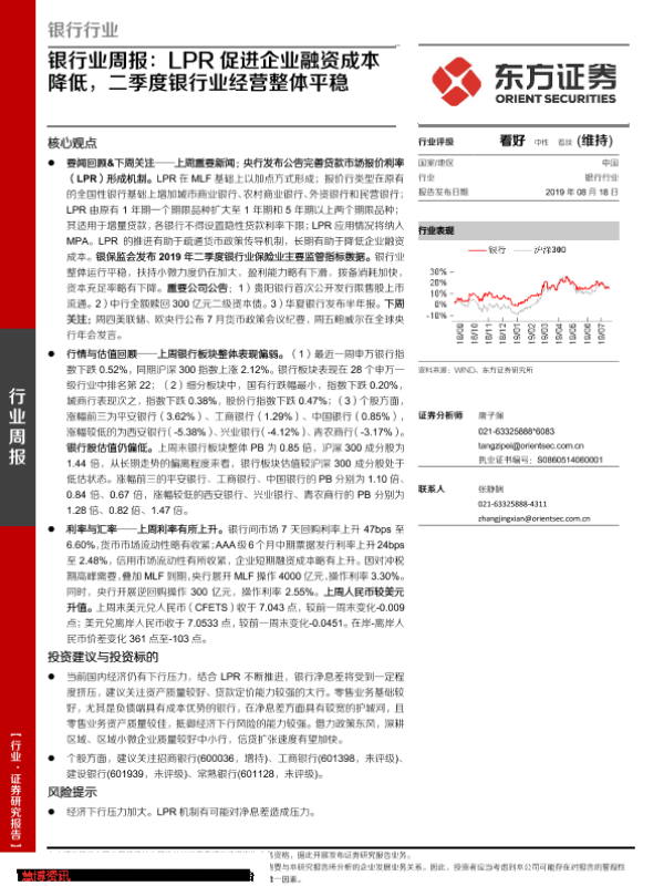 【东方证券】【20190818】银行业周报:LPR促进企业融资成本降低,二季度银行业经营整体平稳-13页