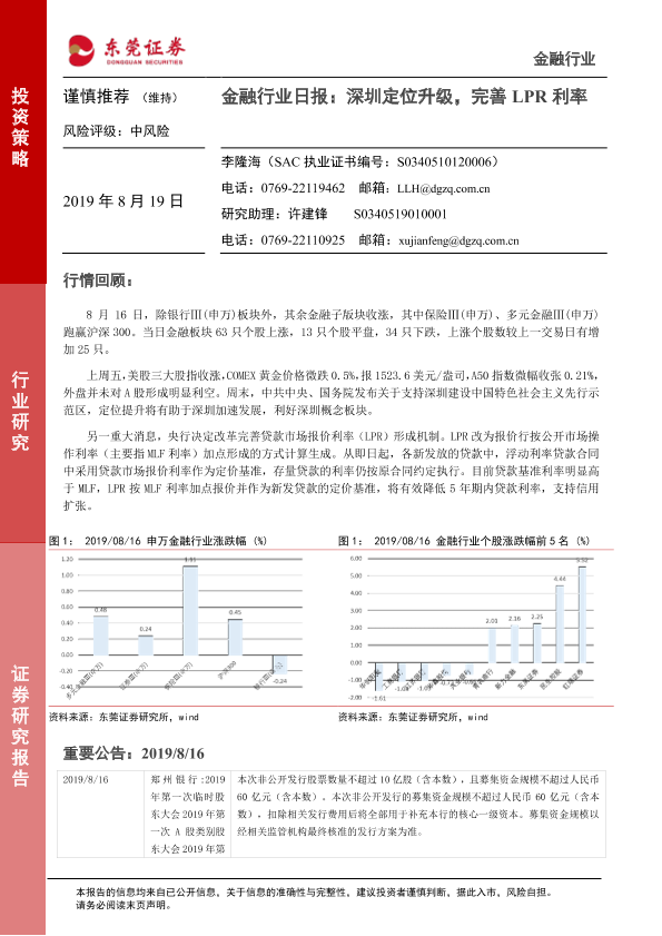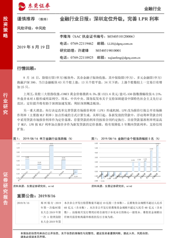 【东莞证券】【20190819】金融行业日报:深圳定位升级,完善LPR利率-6页