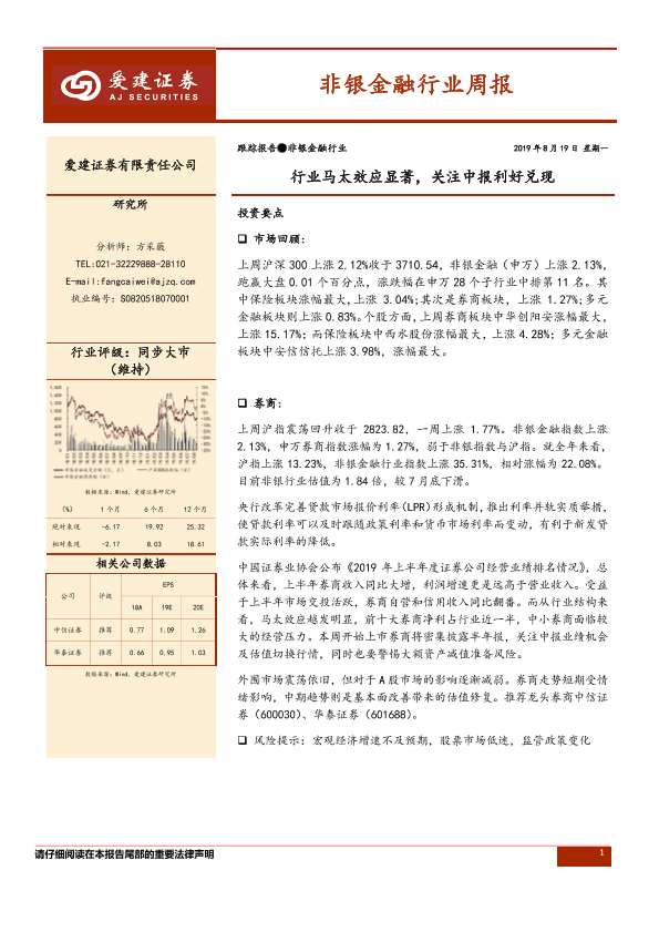 【爱建证券】【20190819】非银金融行业周报:行业马太效应显著,关注中报利好兑现-11页