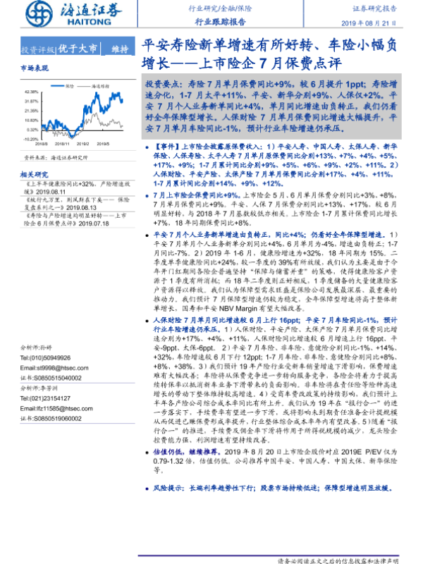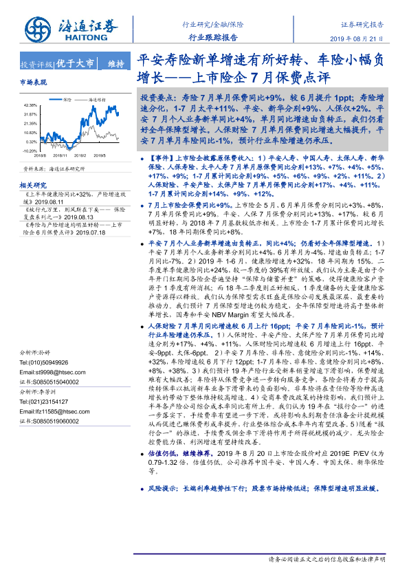 【海通证券】【20190821】上市险企7月保费点评:平安寿险新单增速有所好转、车险小幅负增长-5页