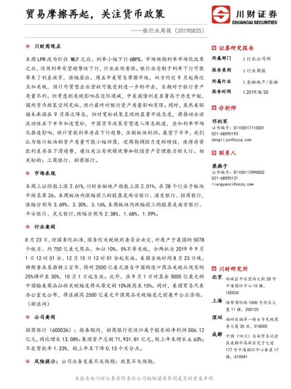 利率市场化 货币政策 贸易摩擦 资产质量 银行业