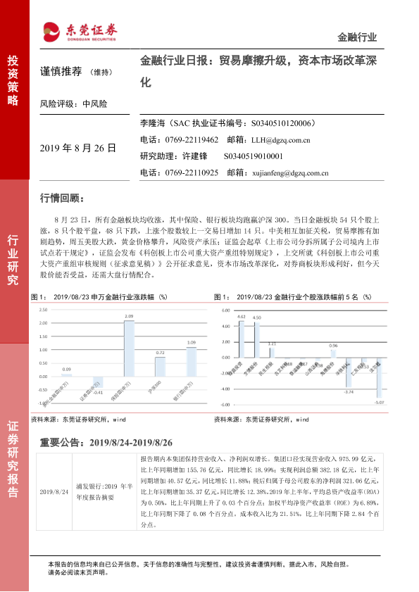 【东莞证券】【20190826】金融行业日报:贸易摩擦升级,资本市场改革深化-8页