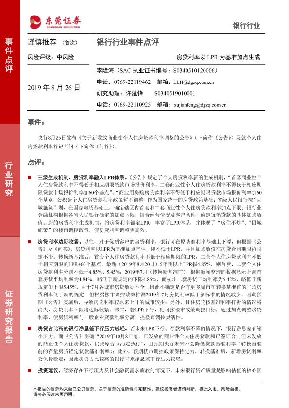【东莞证券】【20190826】银行行业事件点评:房贷利率以LPR为基准加点生成-3页