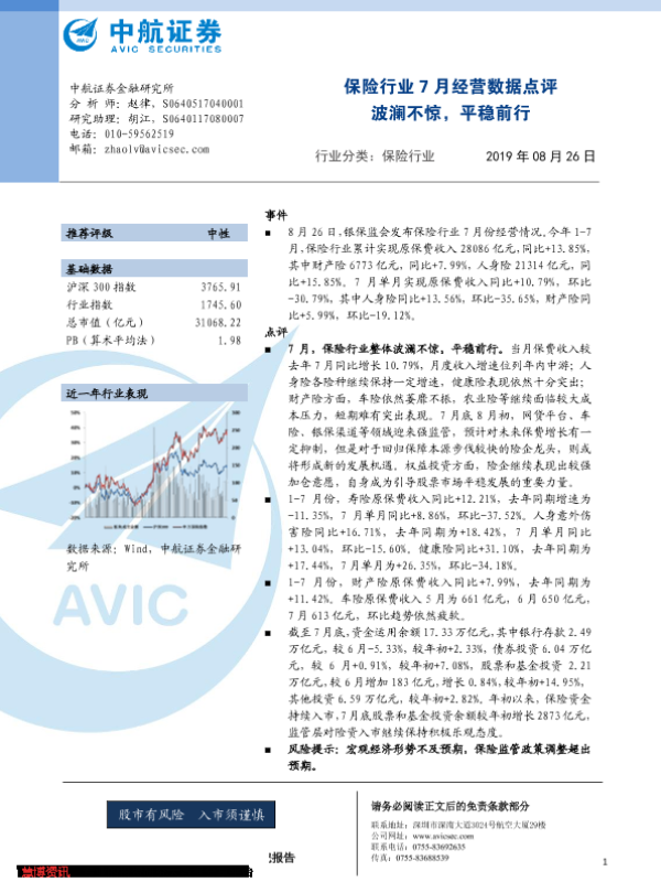 【中航证券】【20190826】保险行业7月经营数据点评:波澜不惊,平稳前行-4页