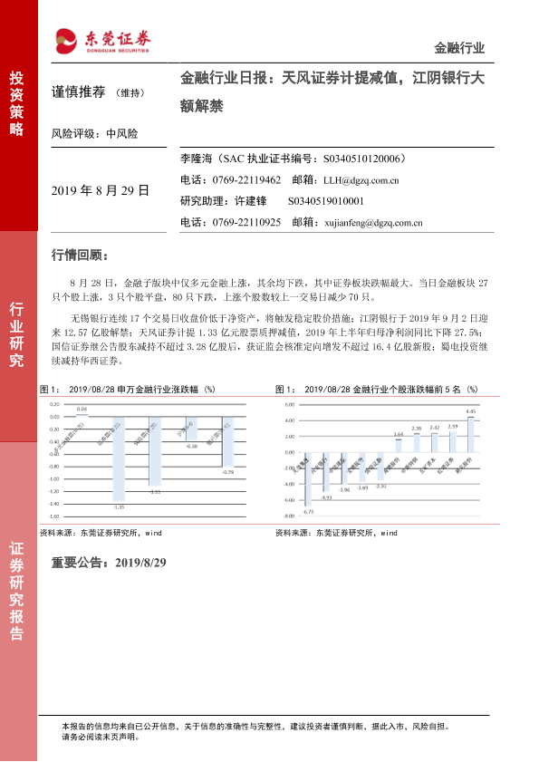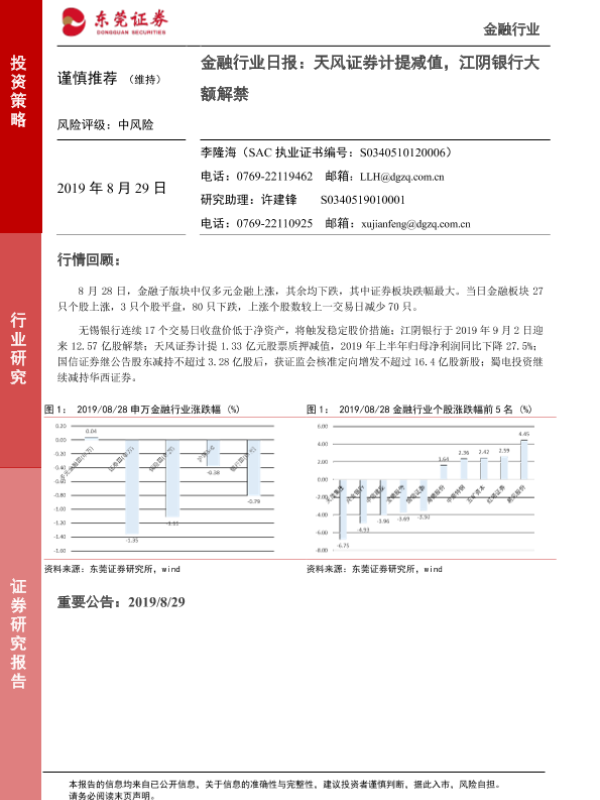 【东莞证券】【20190829】金融行业日报:天风证券计提减值,江阴银行大额解禁-9页