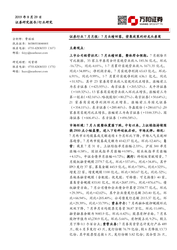 【万和证券】【20190829】证券行业7月月报:7月业绩回落,密集政策利好龙头券商-15页