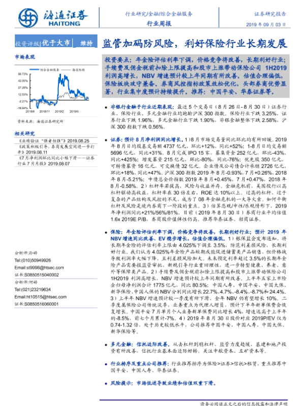 【海通证券】【20190903】综合金融服务行业周报:监管加码防风险,利好保险行业长期发展-9页