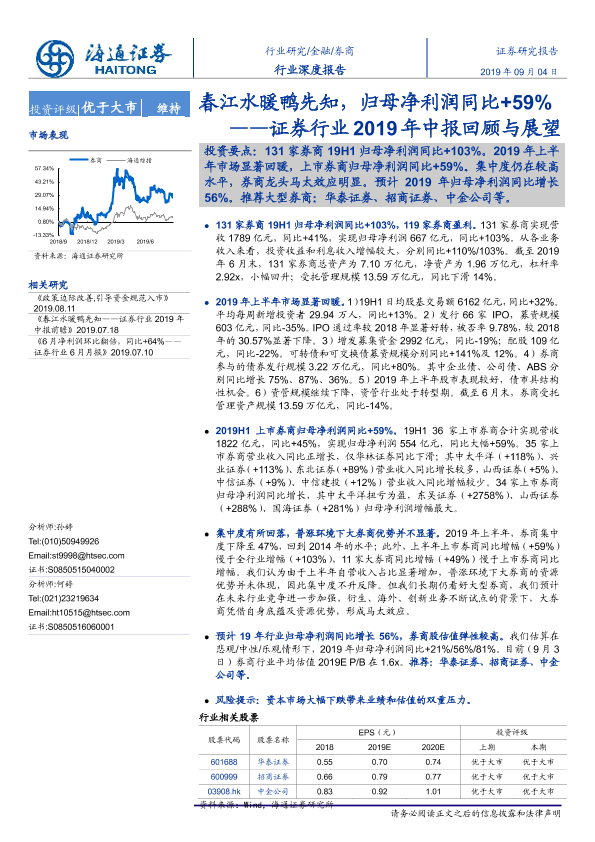 【海通证券】【20190904】证券行业2019年中报回顾与展望:春江水暖鸭先知,归母净利润同比+59%-22页