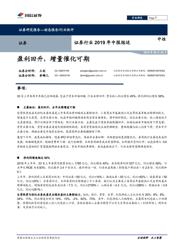 【国信证券】【20190904】证券行业2019年中报综述:盈利回升,增量催化可期-9页