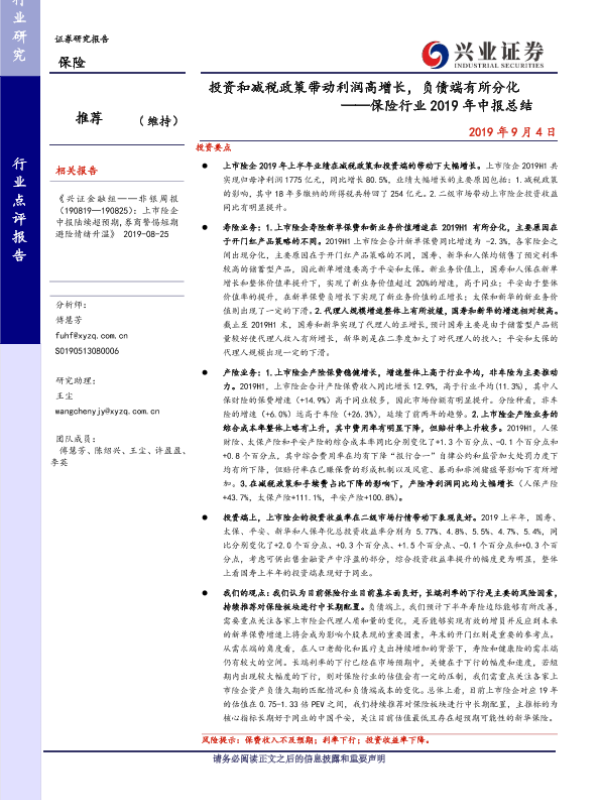 【兴业证券】【20190904】保险行业2019年中报总结:投资和减税政策带动利润高增长,负债端有所分化-13页