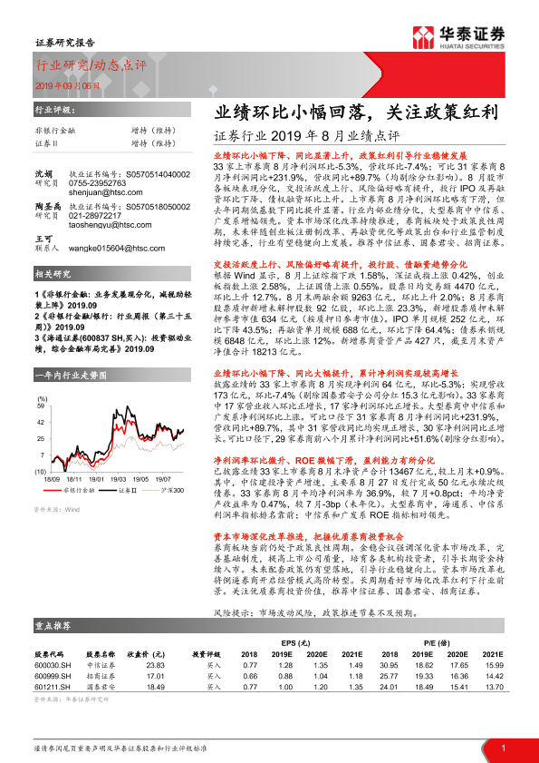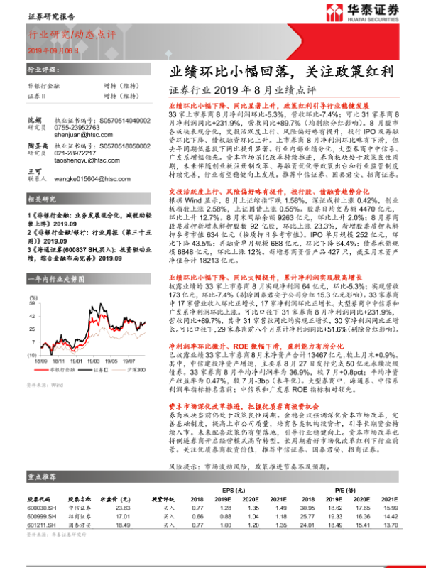 【华泰证券】【20190906】证券行业2019年8月业绩点评:业绩环比小幅回落,关注政策红利-4页