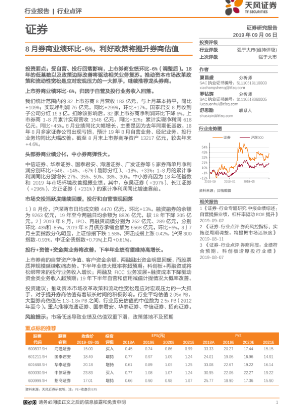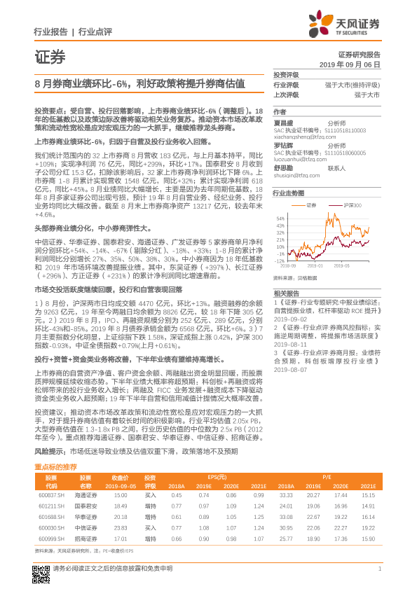 【天风证券】【20190906】8月券商业绩环比-6%,利好政策将提升券商估值-5页