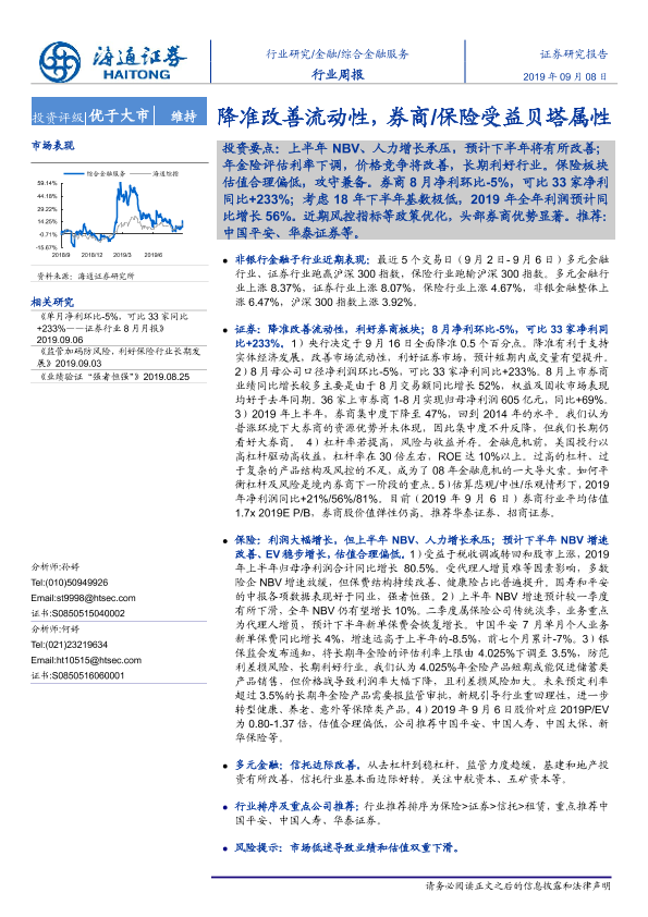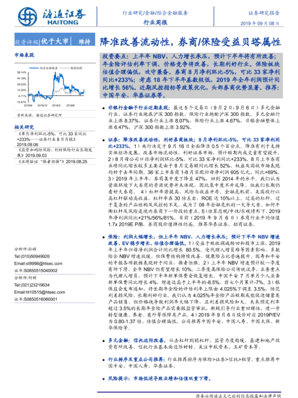 【海通证券】【20190908】综合金融服务行业周报:降准改善流动性,券商 保险受益贝塔属性-9页