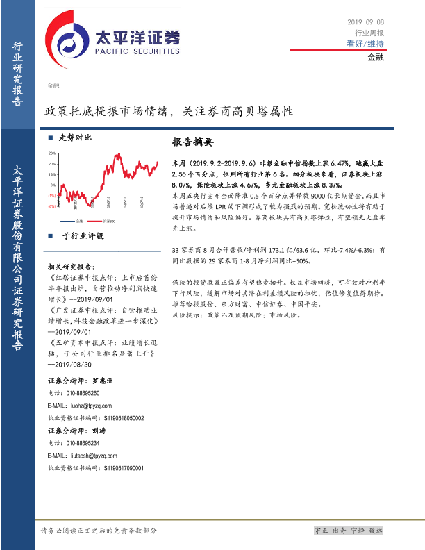 【太平洋证券】【20190908】金融行业周报:政策托底提振市场情绪,关注券商高贝塔属性-13页