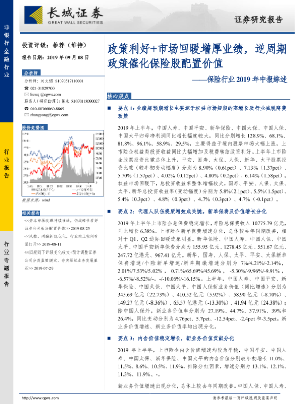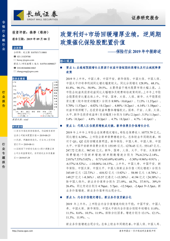 【长城证券】【20190908】保险行业2019年中报综述:政策利好+市场回暖增厚业绩,逆周期政策催化保险股配置价值-25页