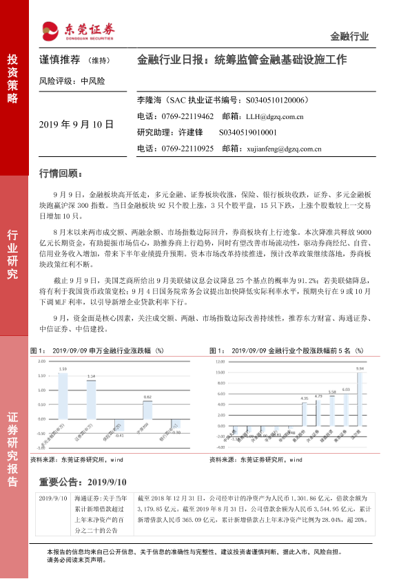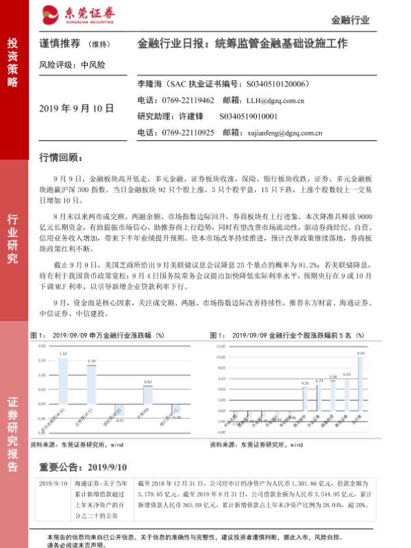 【东莞证券】【20190910】金融行业日报:统筹监管金融基础设施工作-4页
