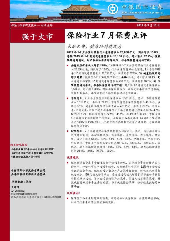 【中银证券】【20190910】保险行业7月保费点评:长治久安,健康险持续发力-6页