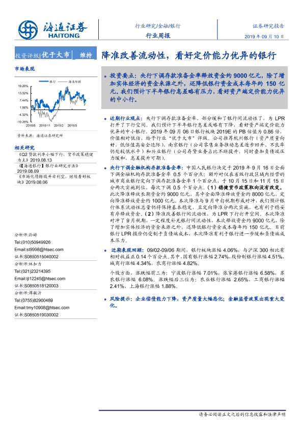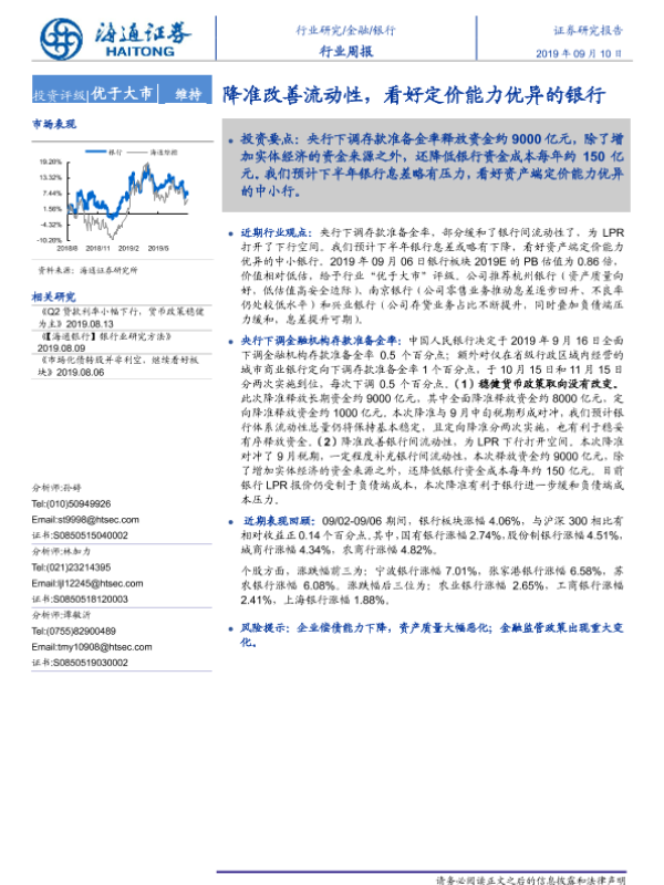 【海通证券】【20190910】银行行业周报:降准改善流动性,看好定价能力优异的银行-8页
