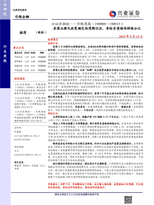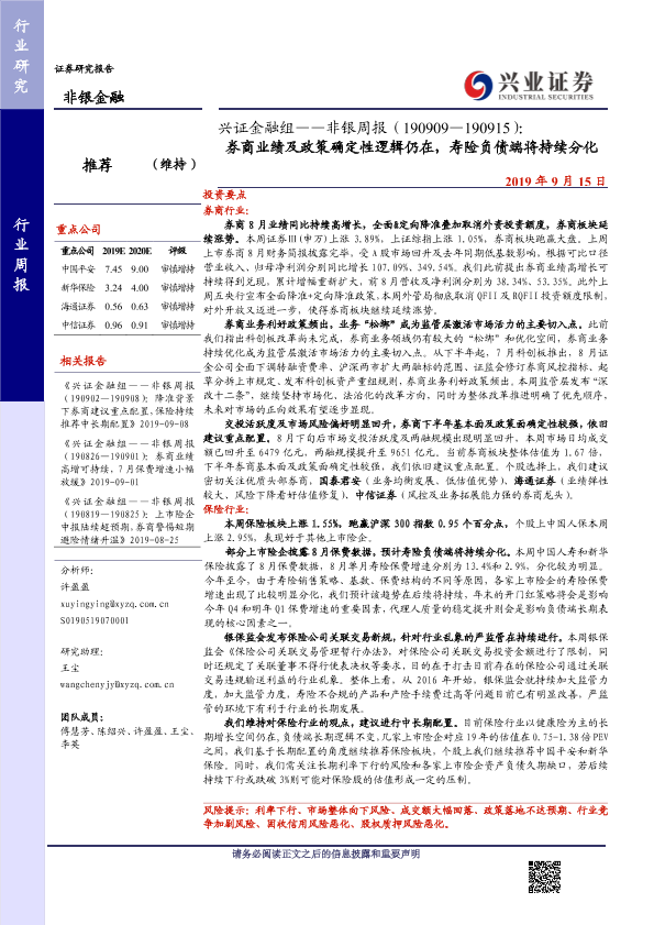 【兴业证券】【20190915】非银周报:券商业绩及政策确定性逻辑仍在,寿险负债端将持续分化-10页